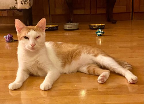 Im April 2024 wurde Caramel noch einmal am Auge operiert. Der Tierarzt meinte, dass er auf dem Auge auf jeden Fall noch etwas sehen kann, aber es wird vermutlich nie so „normal“ aussehen, wie sein anderes Auge. Jeden Tag muss sein Auge gereinigt werden, aber keine Sorge, es klingt schlimmer, als es ist! Die lieben Tierschützerinnen beantworten gerne alle Fragen dazu.