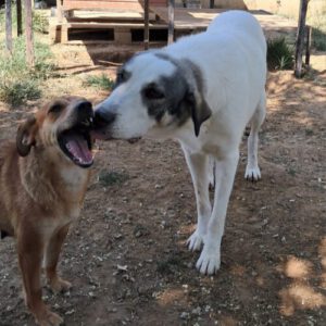 Arianna ist eine imposante, aber ausgesprochen sanfte Hündin Mit ihrem ruhigen Wesen, dem freundlichen Blick und ihrer sozialen Art gegenüber anderen Hunden erobert sie jedes Herz. Sie lebt aktuell in einem größeren Rudel und zeigt sich dort absolut verträglich. Menschen gegenüber ist sie freundlich und ausgeglichen. Sie genießt es, in der Nähe zu sein, drängt sich aber nie auf. Besonders wohl fühlt sie sich an schattigen Plätzen, gerne auch in einer selbst gegrabenen Mulde. Wir vermuten in Arianna einen Herdenschutzhund-Mix, entsprechend suchen wir Menschen mit Erfahrung oder Interesse an diesen besonderen Charakteren. Ein Zuhause in ländlicher Umgebung mit sicher eingezäuntem Garten ist Voraussetzung. Für ein Leben in der Stadt oder einer Etagenwohnung ist Arianna nicht geeignet. Sie braucht keine ständige Action, sondern ein stabiles Umfeld, Ruhe und Menschen, die ihre sanfte Art zu schätzen wissen.