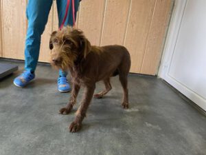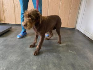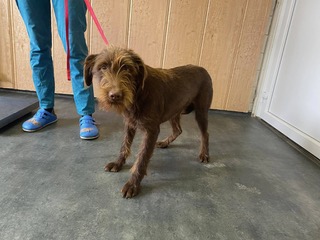 Der außerordentlich hübsche Junghund ähnelt sehr einem Ungarisch Drahthaar. Den Jagdhund in seinen Genen kann er nicht verleugnen. Bei den Einfangversuchen zeigte er sich zurückhaltend und wollte sich nicht greifen lassen. Daher dauerte es einige Tage bis er gesichert werden konnte. In der Station ist der junge Mann momentan überfordert und gestresst. Stand 30.03.2026 war er 53 cm und wog 16 kg. Viel wachsen wird er wohl nicht mehr, aber sicher noch an Gewicht zulegen.