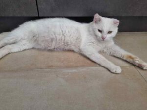 Ich habe ihn gefunden (oder besser gesagt 😀), er hat mich im Garten meiner Eltern gefunden. Seine Ohren waren durch die Sonne geschädigt, besonders das eine. Wir waren in der Tierklinik und leider wurde bei den Untersuchungen festgestellt, dass er FIV-positiv ist. Die gute Nachricht ist, dass seine Ohren nicht durch Krebs geschädigt sind, sondern nur durch die Sonneneinstrahlung aufgrund seiner weißen Farbe. Also habe ich ihn in ein Katzenhaus gebracht und jetzt ist er kastriert, geimpft und bereit für ein neues Zuhause. Vom Charakter her ist er ein wunderbarer, sozialer und ruhiger Kater, der ein richtiges Zuhause verdient. Er lebt momentan mit 13 anderen Katzen zusammen, ist aber nicht besonders an ihnen interessiert. Er sehnt sich mehr nach menschlicher Zuneigung als nach der Zuneigung anderer Katzen, daher ist es kein Problem, ihn als Einzelkatze zu vermitteln. Er kennt auch Hunde, da er draußen lebt. Ich schätze, er ist etwa 5-6 Jahre alt, deshalb habe ich den 03.03.2020 als seinen Geburtstag gewählt.