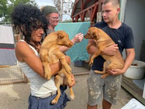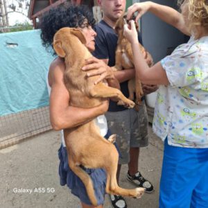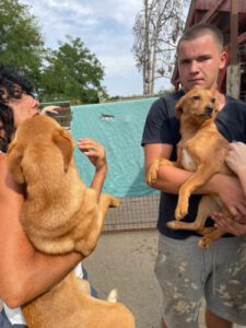 „Ich bin Daru! Gemeinsam mit meiner Schwester Kocsag (auch hier auf der Homepage) möchte ich die Welt entdecken. Wir sind typische Welpen und suchen – selbstverständlich getrennt voneinander – eine liebevolle Familie. Ich bin auf dem Arm des jungen Mannes.