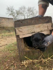 Obwohl wir in unserem Tierheim ausschließlich Hunde aufnehmen, verlieren wir die vielen Straßenkatzen in unserer Umgebung nicht aus den Augen. Wir versorgen sie mit Futter und kleinen, wettergeschützten Hütten. In genau einer dieser Hütten wurde kürzlich ein winziger, erst wenige Wochen alter Welpe ausgesetzt – jemand hielt sie offenbar für einen geeigneten Ort, um ihn dort einfach zurückzulassen.