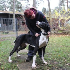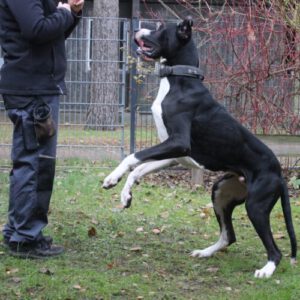 Manetti ist ein stattlicher, junger und vor allem sehr sensibler Rüde (Dt. Dogge, geb. 06/2024), der tief im Herzen ein riesiges Kuschelmonster ist. Er liebt Nähe, Wärme und seine Menschen – für ihn ist seine Familie alles.