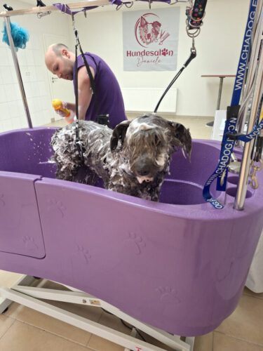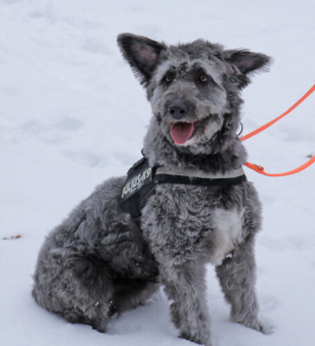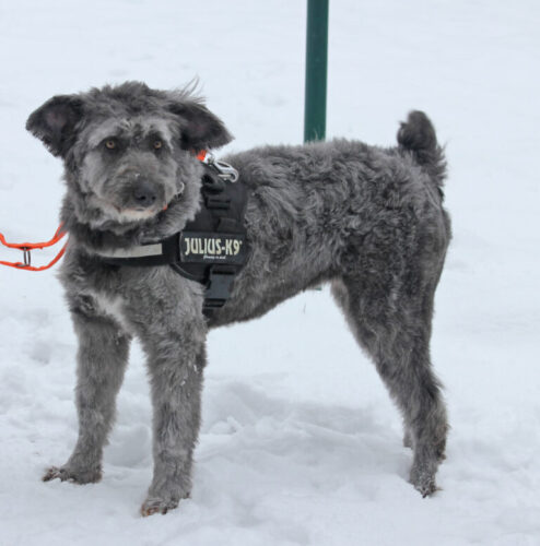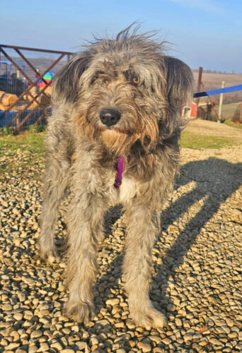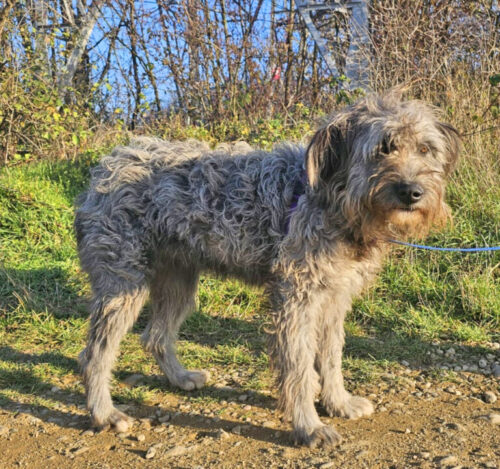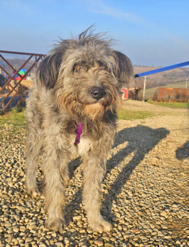 Sie hat eine kurze Rute. Kelly wurde im Juli 2023 geboren und ist 55 cm groß. Sie hat ein graues kurzes Strubbelfell. Im Tierheim wurde sie gechipt, geimpft, kastriert und von Parasiten befreit. Vor ihrer Ausreise bekam sie einen Test auf Herzwürmer mit negativem Ergebnis.
