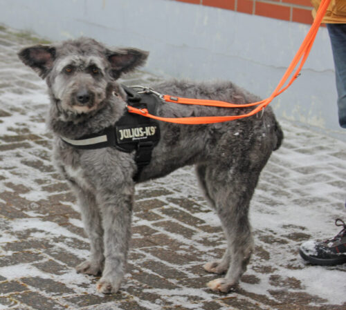Sie läuft inzwischen ganz gut an der Leine. Bei Hundebegegnungen ist sie noch etwas zurückhaltend. Im Übrigen versteht sich gut mit anderen Hunden.