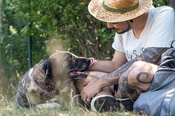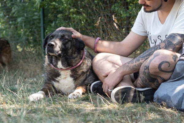 Außerdem zeigt er uns auch, wie gerne er massiert, gekuschelt und gestreichelt werden will. Wenn wir uns bei der Hitze eine Pause gönnen und in den Schatten setzen, fordert er seine Streicheleinheiten regelrecht ein. Er läuft entspannt an der Leine, und natürlich könnte er auch ein paar Kilo abnehmen, damit er wieder etwas fitter wird.